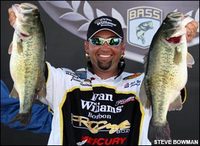 実際に釣りがスタートすると、ジェイソンはノンボーターのボクにとってすごく嫌なヤツになりました。極寒の中、ロングドライブを繰り返し、中州のヨレばかりをバイブレーションでランガンするかと思えば、今度は流れの当たるバンクをショートレンジでブライアンクランクベイトをフリップキャストしながら、トローリングモーターを最速にして流し、アタリがあったピンポイントでは、フラートワーム&シェイキーヘッドに持ち替え、完璧なボートポジションをキープするので、ボクに投げ入れるスキがないのです。ジェイソンは見事リミットメイクに成功し、今度はスイートビーバーのフリッピングでランガンし、ラージマウスで入れ替えを狙う作戦に変更しました。ときには1投だけして移動してしまいます。ボクが今まで釣りをした中で、もっとも忙しくて厳しいプロでした。ジェイソンはこの日だけならトップ10に入るウェイトでしたが、惜しくもトップ10カットを逃しました。