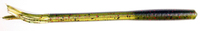 5インチサイズのストレート系ワームで、名前をギッギー・スティックといいます。同社のジグヘッド”ギッギー・ヘッド”とほぼ同時発売です。ギッギー・スティックはボディーの3/5は中空になっていて、テール部はチューブワーム同様スカート状になっています。たいへん浮力が大きいのが特徴で、中にラトルを挿入することも可能で、スモールシルエットながらハイアピールで誘うことも可能です。ネコリグで使用すると、完全にラインをフリーな状態にしても、ワームは湖底で垂直立ちして、ユラユラ揺れて、かなりいい感じでした。