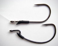 このBMFバーブはストレートフックだけでなく、オフセットフックにも使えます。日本ではワームのズレ防止用のシリコンストッパーが売られていますが、ズレ防止効果では熱収縮チューブの方が断然高いです。しかも、シリコンストッパーはワームの付け替えが面倒(ラインをカットして、アイ側からワームを刺してからラインを結ぶ)ですが、熱収縮チューブならそのままノーマルフックと同様にハリ先側からワームがセットできます。