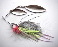 その注目のチャートリュースシャッドカラーをスピナーベイトで表現してみようと、ハンドタイイングしてみました。シャッド系のゼブラ模様のブルークリスタルラメのスカートをバックにチャートリュースを両サイドに3本ずつ、そしてベリーにハイライトブルーのスカートをタイイングしました。ウォーイーグルのイメージでベリーのハイライトブルーのスカートだけ前方を短くカットして、大きくフレアさせてみました。また、エラのイメージで赤のファインラバーを巻いて短くカットし、さらにアクセントでティンセルとデプスのフラッターカットスカートを2本、トレーラー風に長めにセットして巻いてみました。なかなかセクシーだと思いませんか?