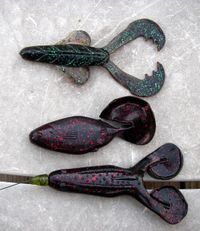 レイジ・トード:ホニートードのアピール度をアップさせたような分厚いテールが特徴です。レイジシャッドほどではないですが、スローリトリーブでは動きません。というより回転してしまって、話になりません。ただ、アピール度はかなり高いです。高速リトリーブが基本なので、フックがひっくり返ることも多いので、フックにシンカー(カウンター)の付いたタイプが良さそうです。