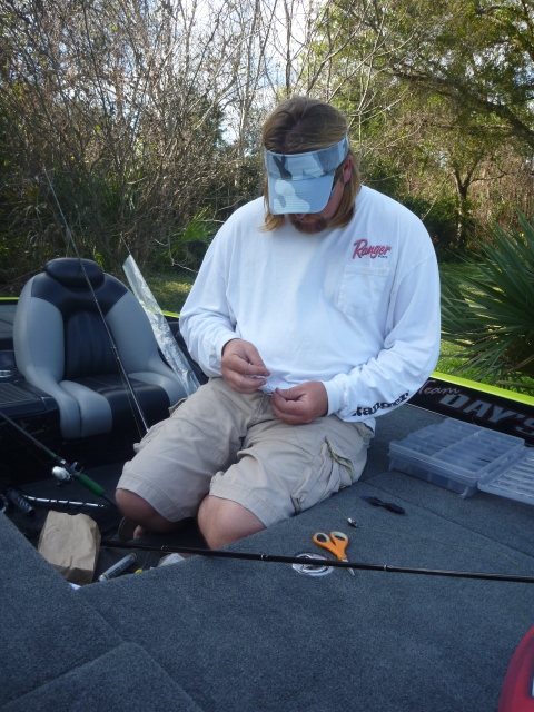 肝心のスネリングですが、JTは内掛け本結び(ユニノット)で、ループの中にはラインを5回通して締め込んでいました。ボクは外掛け本結びをしていますが・・・。そして、他のアングラーがよくするように、やはりブレイドラインをシンカーから約1mぐらいはサインペンで黒く塗っていました。カモフラージュ効果があるとアメリカ人はみんな信じています。